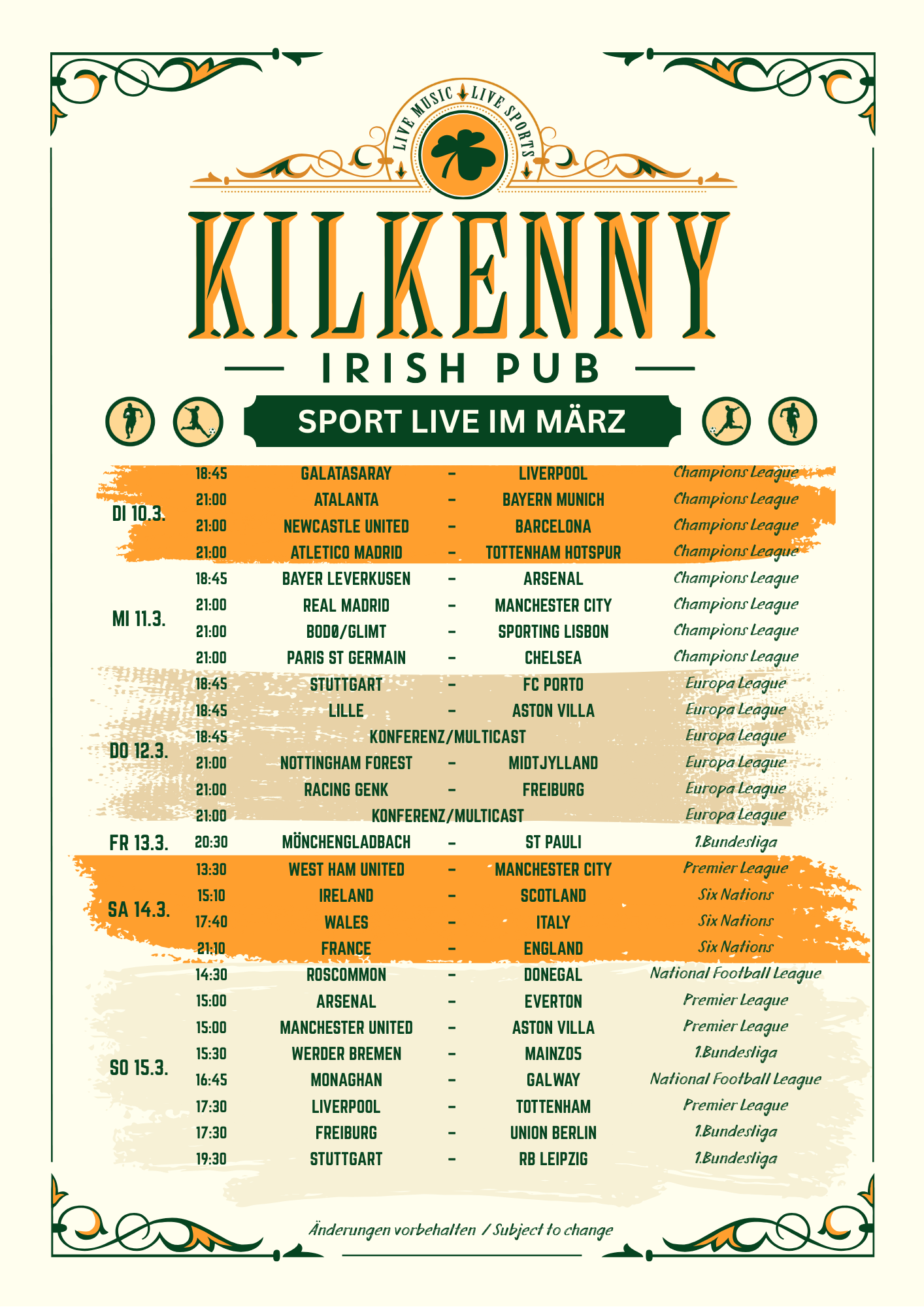 Als Sport Bar in Berlin zeigen wir viele Live-Sportübertragungen auf mehreren großen Bildschirmen, wie zum Beispiel English Premier League, Champions League, Europa League, Bundesliga, Rugby und Gaelic Sports (GAA).
